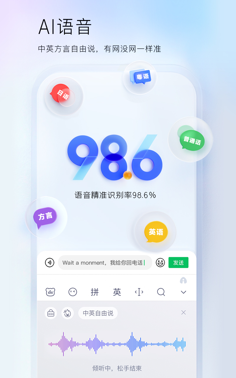 【基本功能】【YAN键盘】颜/言/研新皮肤上线,多图滚屏,文案多变,每次输入都有小惊喜;【定制皮肤】材质多,支持多图DIY,多变文案DIY;【智能预测】根据情景猜你想说的,智能补齐全句;【AI智能输入】自适应输入场景,字更智能;【AI语音输入支持中英混合免转换,方言免转换,快速更准确;【离线语音】断网弱网语音输入同样准确;【AR表达式通过人脸识别系统制作各种有趣的表达式;【超大系统词库】50万系统词库,输入流畅,选词准确;【人工智能模块】智能全句输入算法加纠错算法,提高准确性;【快速搜索】边聊天边搜索,一步一个脚印;【游戏键盘】游戏语句、悬浮语音、和谐转换三大神器,助力冲分,无敌必备;【懒人语句】内置多个语句进行分类,支持添加个人常用词;【自动同步】客户网络词,设置项,个性化短语云备份自动同步;【超中英混合输入】汉语、英语、数据、标记自由混合输入;【智能笔写】支持叠加;边写边写,识别速度快;毛笔字效果;【多种输入方式】支持拼音、英语、笔画、五笔、语音等输入方式;【语音速记】声纹差异角色技术在输入法中首次登录;